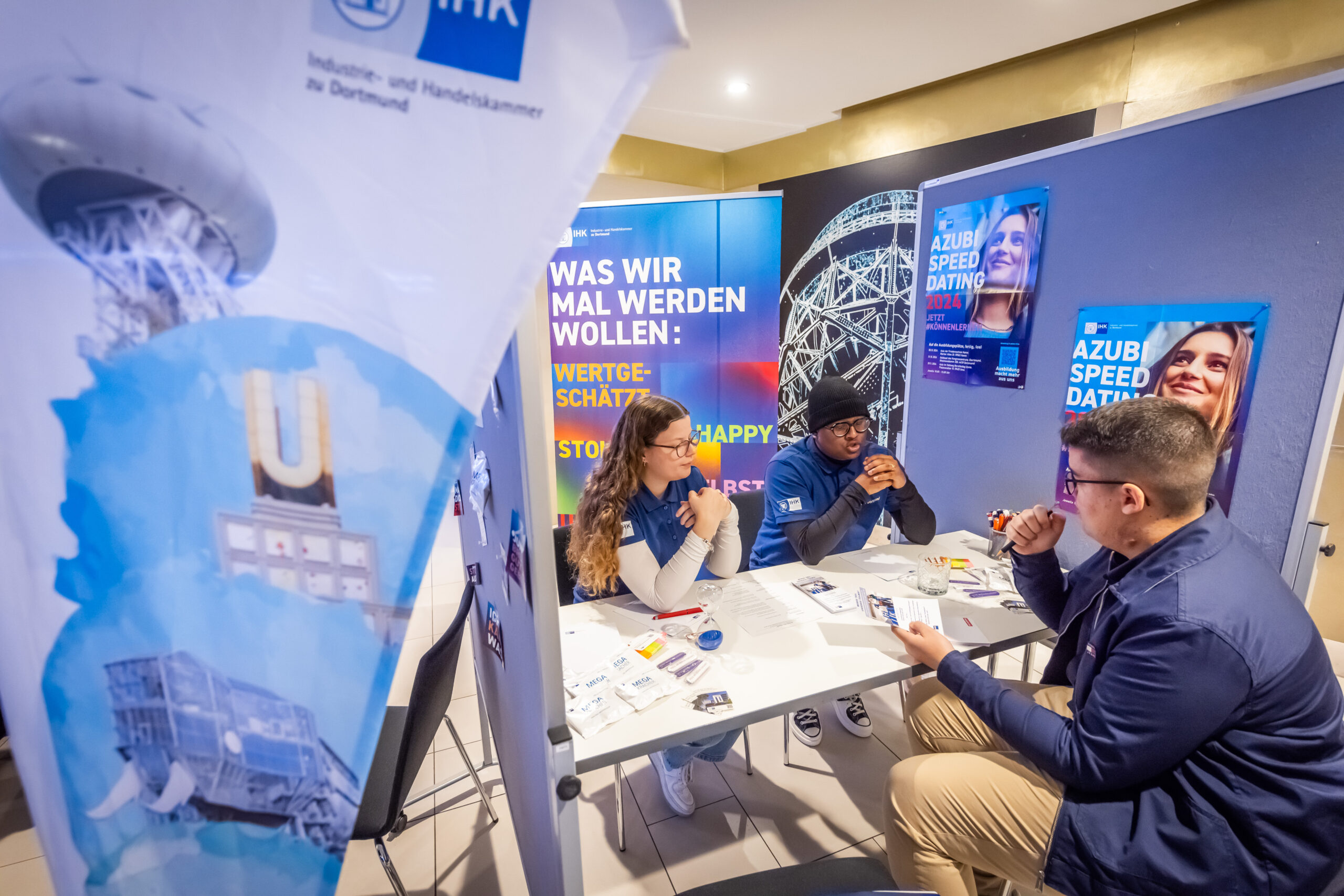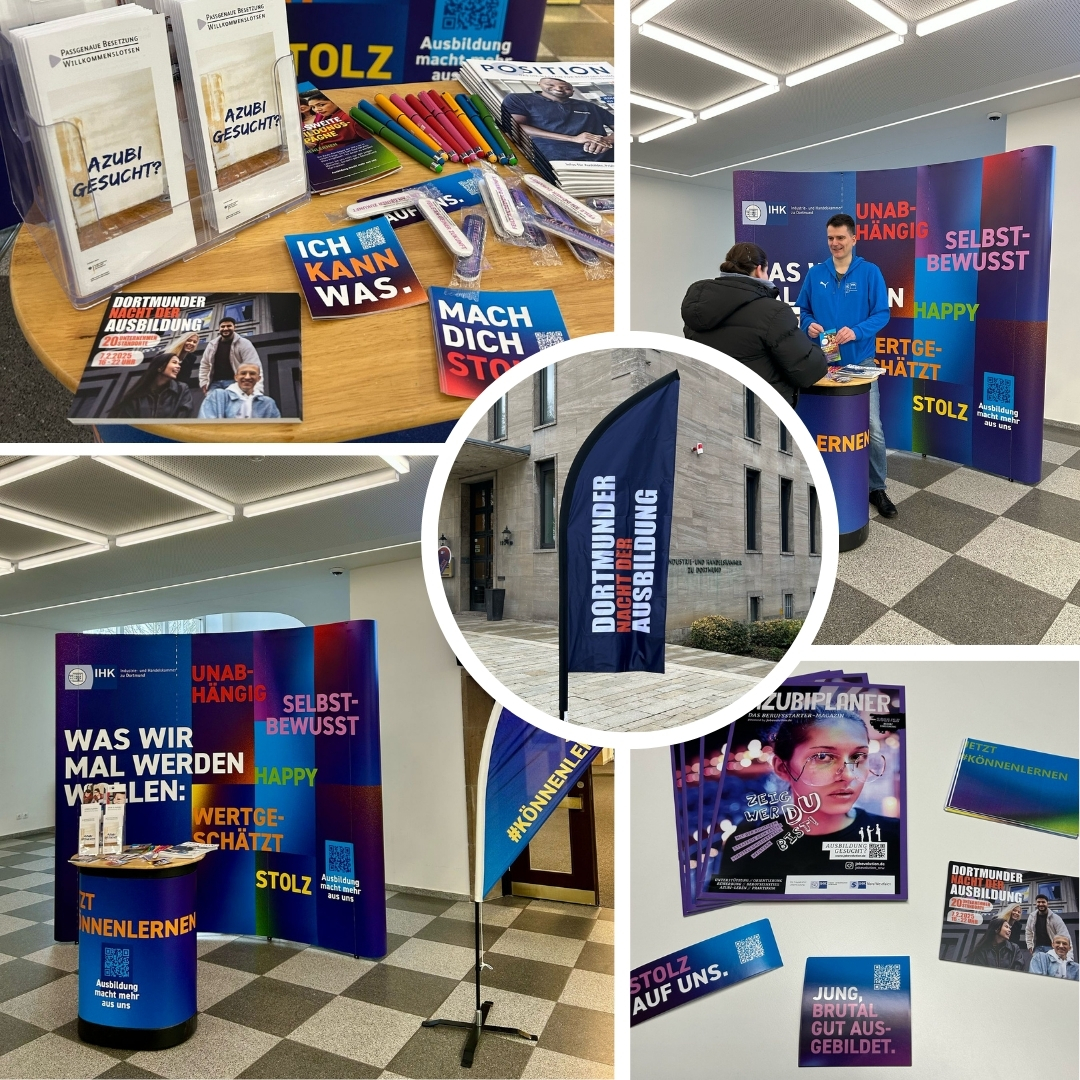 Sie ist für Politik, Verwaltung, Wissenschaft und jedermann ein fachkundiger und zuverlässiger Ansprechpartner in allen Wirtschafts – und Bildungsfragen. Die IHK ist kompetenter Ratgeber und Initiator in allen Fragen der beruflichen Bildung. Sie berät und unterstützt Betriebe und Auszubildenden gleichermaßen in der beruflichen Erstausbildung. Neben der eigenen Berufsausbildung informiert die IHK während der Dortmunder Nacht der Ausbildung über alle Ausbildungsberufe und Ausbildungsmöglichkeiten (gut 5000 freie Ausbildungsstellen bei ca. 3000 Ausbildungsbetrieben) aus dem Bereich Handel, Industrie, Dienstleistung sowie IT und Medien. Des Weiteren führt Sie Workshops zur Ausbildungsplatzsuche und Bewerbung durch.
